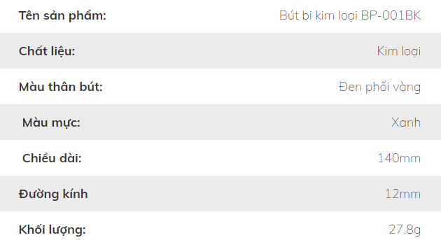 Bút bi kim loại BP-001BK là dòng bút cao cấp với thiết kế sang trọng, thân bút đen phối vàng, mang lại sự đẳng cấp và chuyên nghiệp. Đây là lựa chọn hoàn hảo cho các doanh nghiệp khi tìm kiếm sản phẩm quà tặng dành cho nhân viên, khách hàng, đối tác hoặc sử dụng trong các sự kiện, hội nghị.