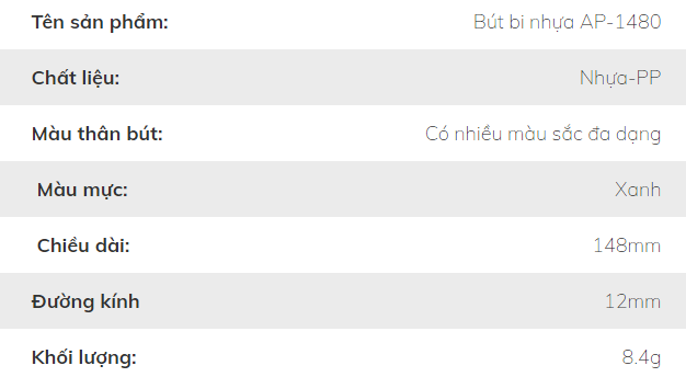 Bút được trang bị ngòi bi 0.7mm cùng mực xanh tiêu chuẩn, cho nét chữ mượt mà, đều màu, không bị lem. Với khả năng in ấn logo theo yêu cầu bằng công nghệ in lụa hoặc in UV hiện đại, AP-1480 là lựa chọn lý tưởng để doanh nghiệp sử dụng làm quà tặng quảng cáo, hội nghị, sự kiện hoặc tri ân khách hàng.