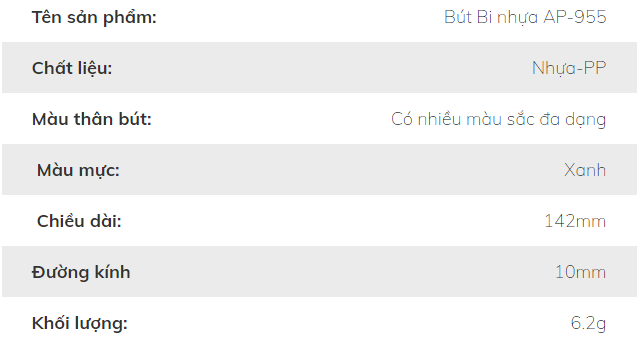 Bút bi nhựa AP-955 là dòng bút bi giá rẻ, thiết kế đơn giản, hiện đại và nhiều màu sắc trẻ trung. Đây là sản phẩm quà tặng doanh nghiệp được nhiều phòng Marketing, HR, bộ phận Mua hàng lựa chọn cho các chương trình khuyến mãi, tri ân khách hàng, tặng nhân viên hoặc sử dụng trong hội nghị – hội thảo.