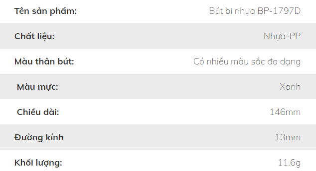 Bút bi in logo BP-1797D là mẫu bút nhựa PP trong mờ hiện đại, thiết kế trẻ trung với nhiều gam màu nổi bật. Thân bút thanh mảnh, có cài bút bo tròn kèm chi tiết tròn tạo điểm nhấn giúp thương hiệu nổi bật khi in ấn. Với ngòi bi 0.7mm và mực xanh thông dụng, bút cho nét viết êm, đều, phù hợp mọi đối tượng sử dụng trong doanh nghiệp lẫn trường học. Đây là lựa chọn tối ưu cho các chương trình quà tặng số lượng lớn nhờ giá thành hợp lý, thời gian làm nhanh và khu vực in rộng để thể hiện logo, slogan, hotline.