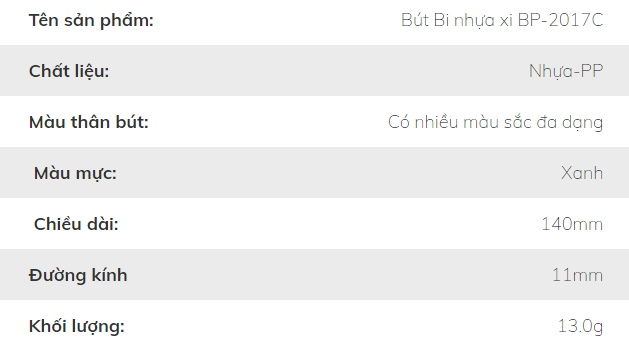 Bút bi nhựa xi BP-2017C là mẫu bút bi cao cấp với thiết kế tinh tế, thân bút phối kim loại sang trọng, mang đến sự chuyên nghiệp cho doanh nghiệp trong mọi hoạt động quà tặng. Đây là dòng sản phẩm được nhiều công ty, trường học, tổ chức sự kiện lựa chọn để in logo, slogan nhằm quảng bá thương hiệu hiệu quả.