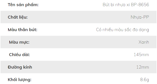 Sản phẩm bút bi nhựa xi BP-8656 có thiết kế thân bạc sang trọng, phối nhiều màu sắc tươi trẻ như xanh, đỏ, vàng, xanh lá. Kiểu dáng hiện đại, dễ cầm nắm, chất liệu nhựa PP bền đẹp cùng ngòi bi 0.7mm cho nét mực đều, mượt, mang đến trải nghiệm viết thoải mái cho người dùng.
