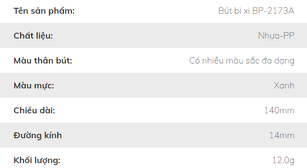 Bút bi xi BP-2173A là một trong những dòng bút bi in logo được nhiều doanh nghiệp lựa chọn làm quà tặng quảng cáo, hội nghị và sự kiện. Với thiết kế sang trọng, thân bút nhựa xi bóng loáng kết hợp phần tay cầm màu nổi bật, sản phẩm không chỉ mang đến trải nghiệm viết êm ái mà còn giúp nâng tầm hình ảnh thương hiệu khi in ấn logo theo yêu cầu.