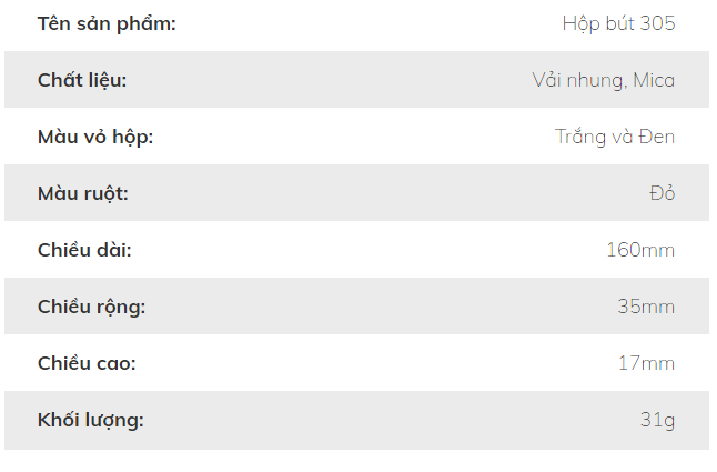 Màu sắc: Trắng, Đen (vỏ hộp), Đỏ (ruột nhung)